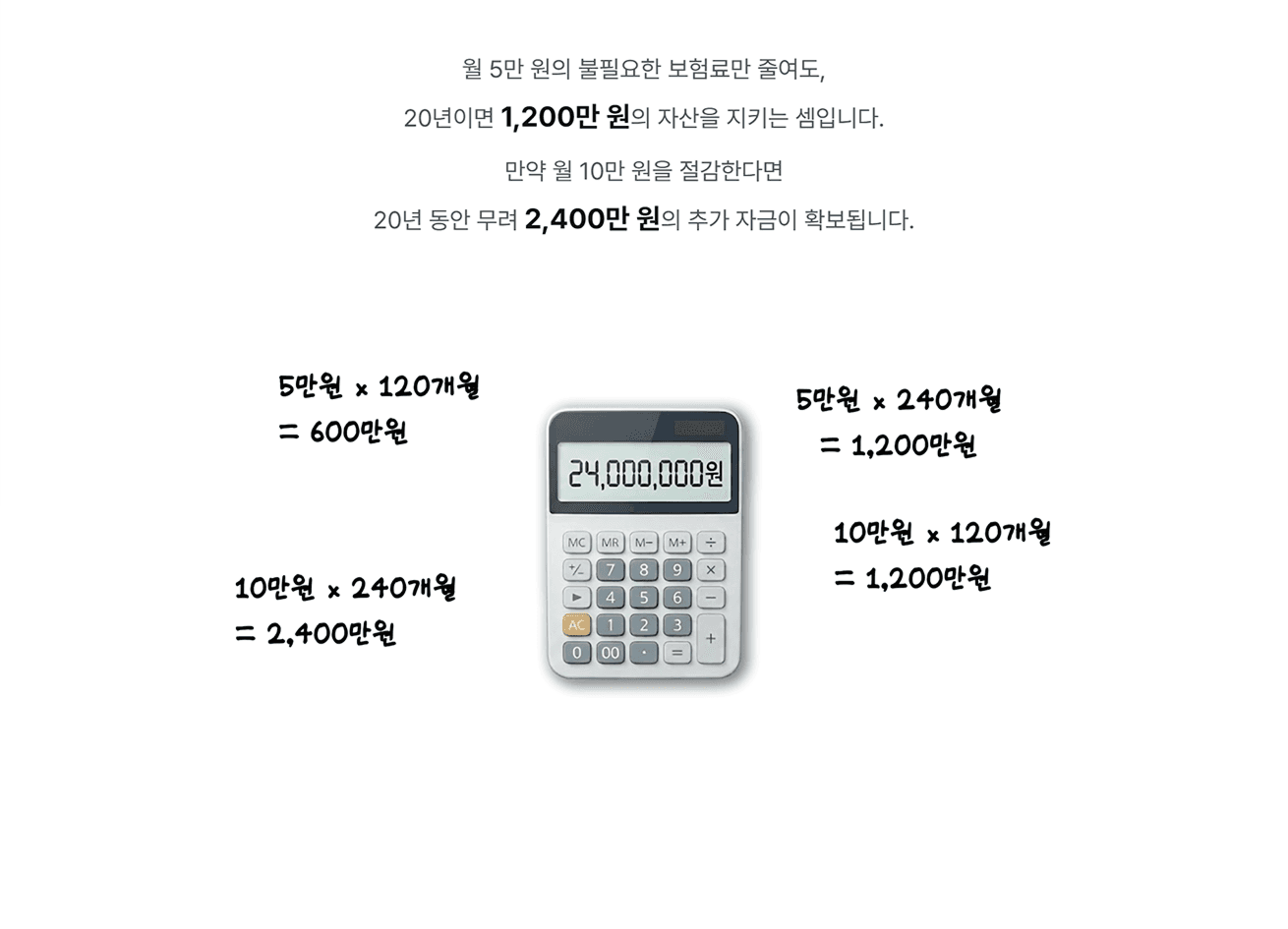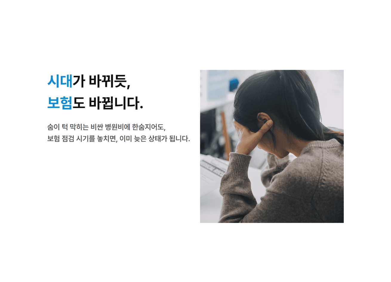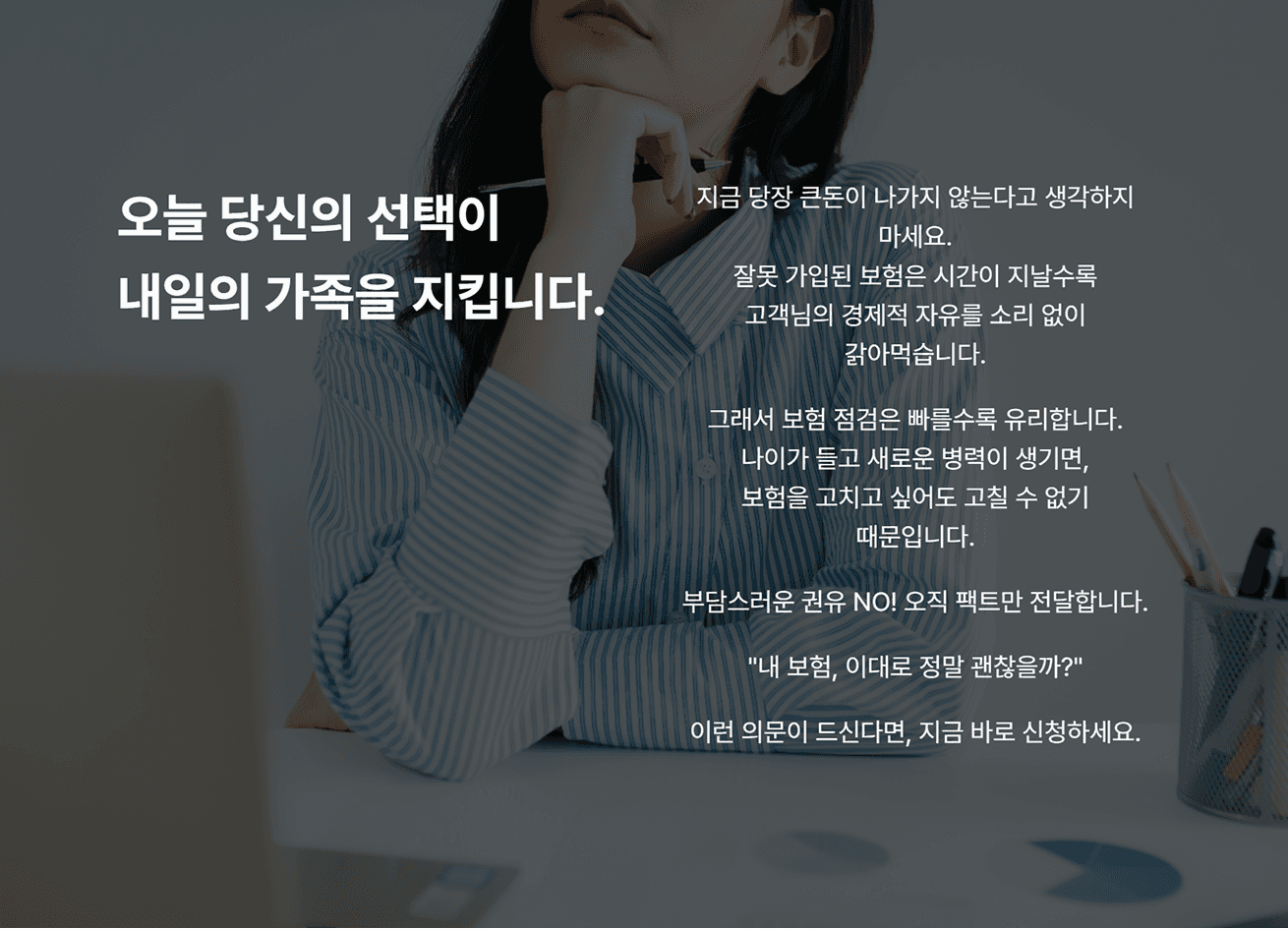 도입부에 보험 정밀 점검 서비스의 필요성을 느끼지 못하고 단순 영업에 대한 고객이 느낄 거부감을 낮추고 설득하기 위해 고객의 언어로 공감대를 형성하였습니다. 일방적인 정보 전달이나 가입 강요가 아닌 고객의 시선에서 출발한 문제 제기를 통해 서비스 진입 심리적 부담을 최소화하였습니다. 이후 무의식적으로 방치해온 보험이 손실로 이어질 수 있음을 인과관계로 짚어내어 점검 서비스의 당위성을 드러내었습니다.