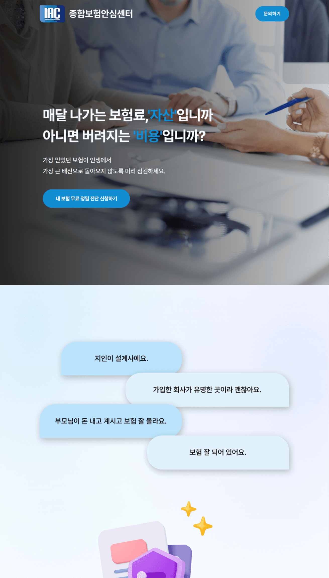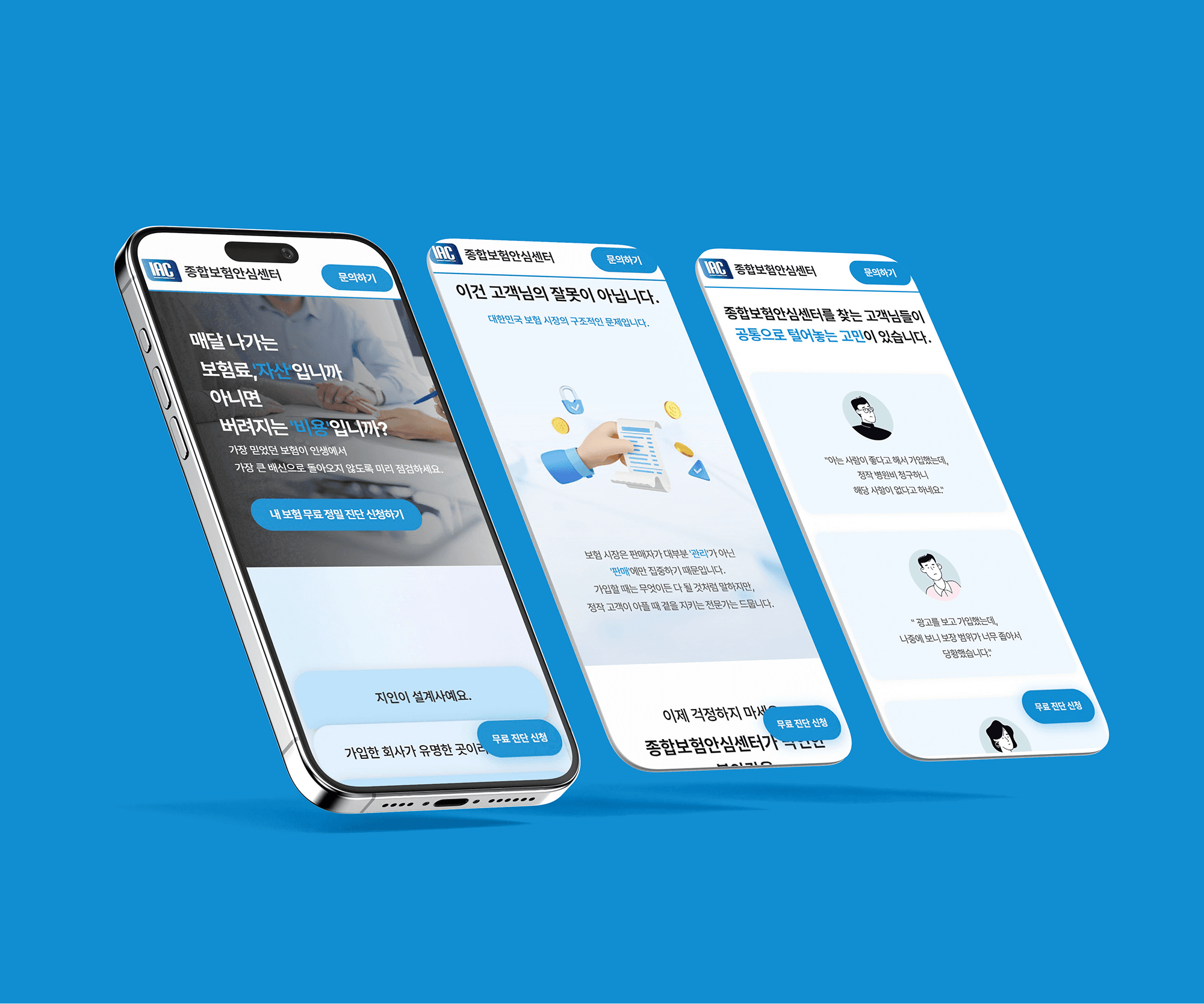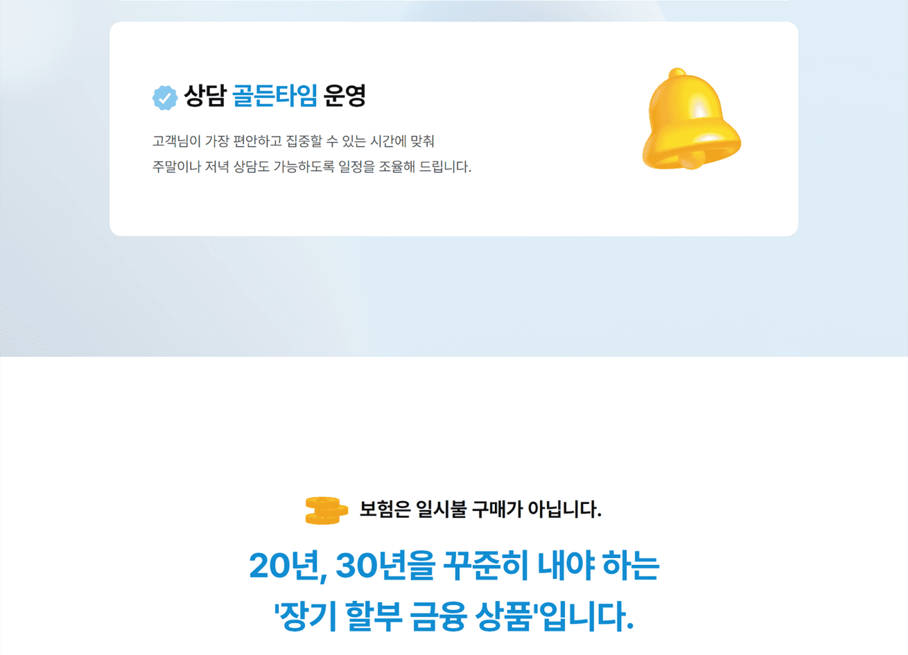 강압적인 영업 느낌을 주던 기존 보험 업계의 이미지를 탈피하고 고객의 심리적 거부감을 낮추고자 하였습니다. 보험 컨설팅으로서의 무게감을 잃지 않도록 전문성이 느껴지는 블루 계열을 메인 컬러로 시각적인 신뢰도를 확보합니다. 동시에 자칫 무겁고 지루해질 수 있는 보험 이야기를 부드럽게 환기하고자 트렌디한 3D 오브젝트를 활용하였습니다. 궁극적으로 텍스트 위주 딱딱한 정보 전달에서 벗어나 고객과 깊은 공감대를 형성하고 정보 습득의 피로도를 낮추는 편안한 사용자 경험을 구현하고자 하였습니다.