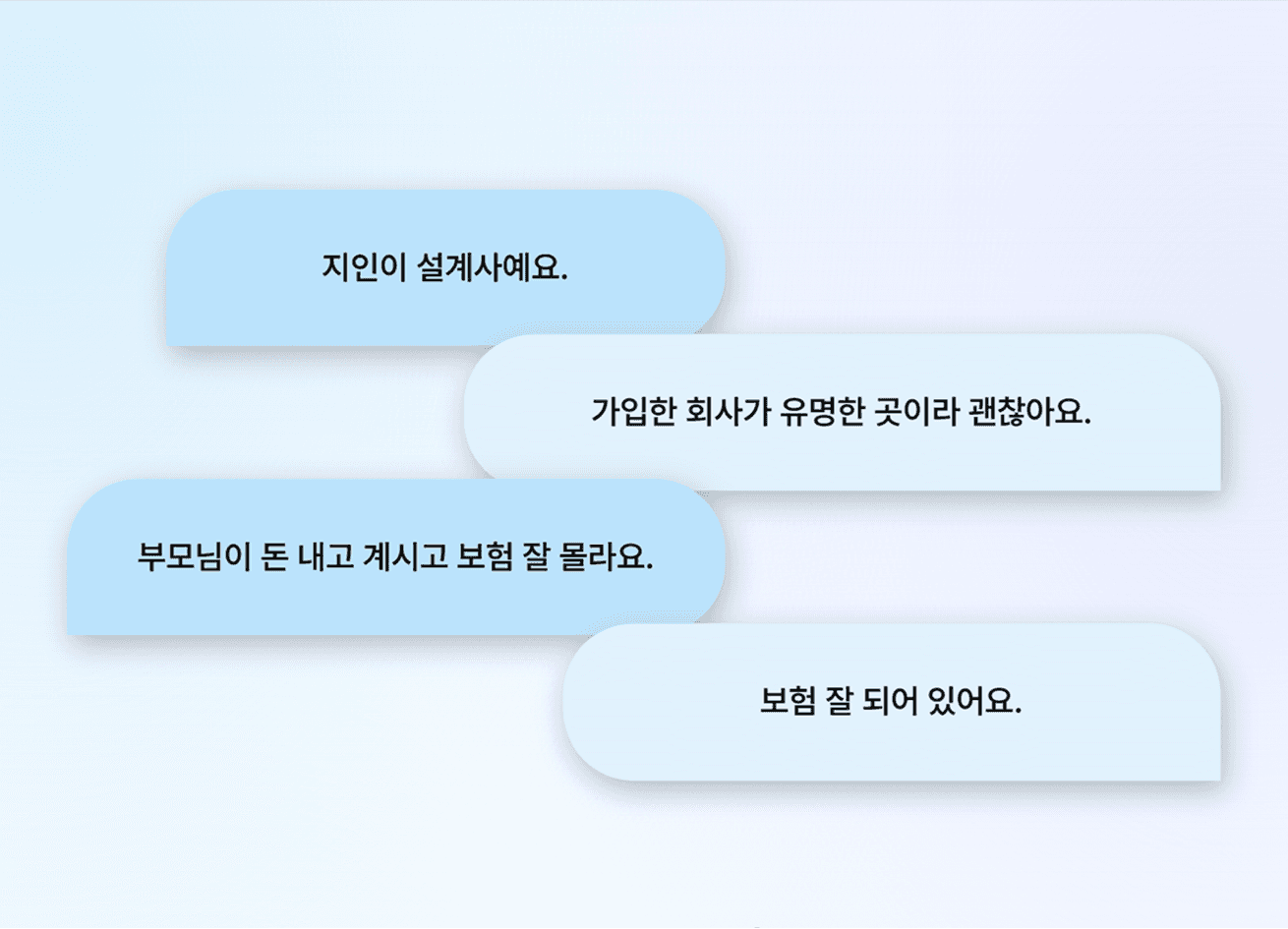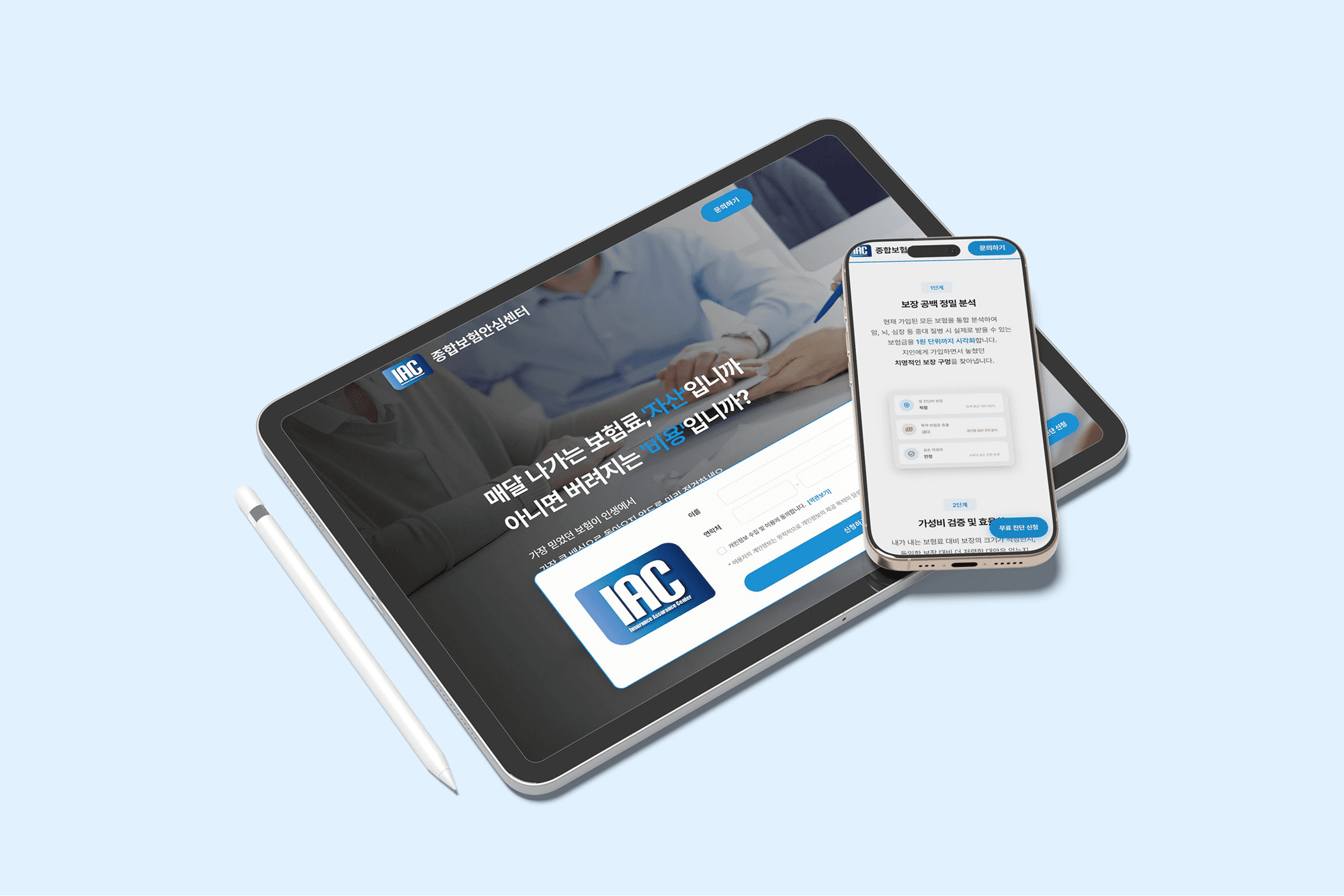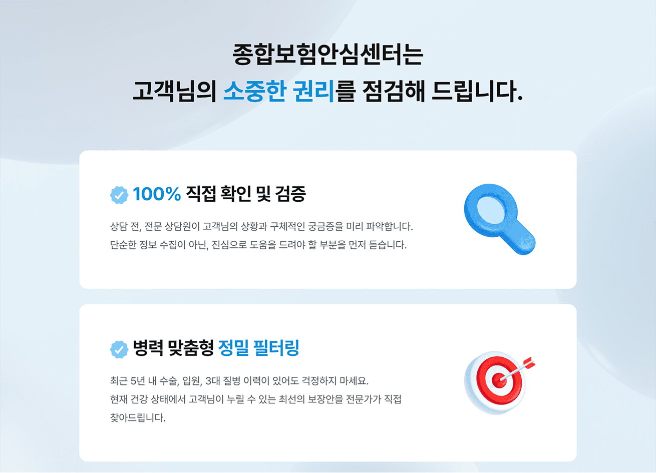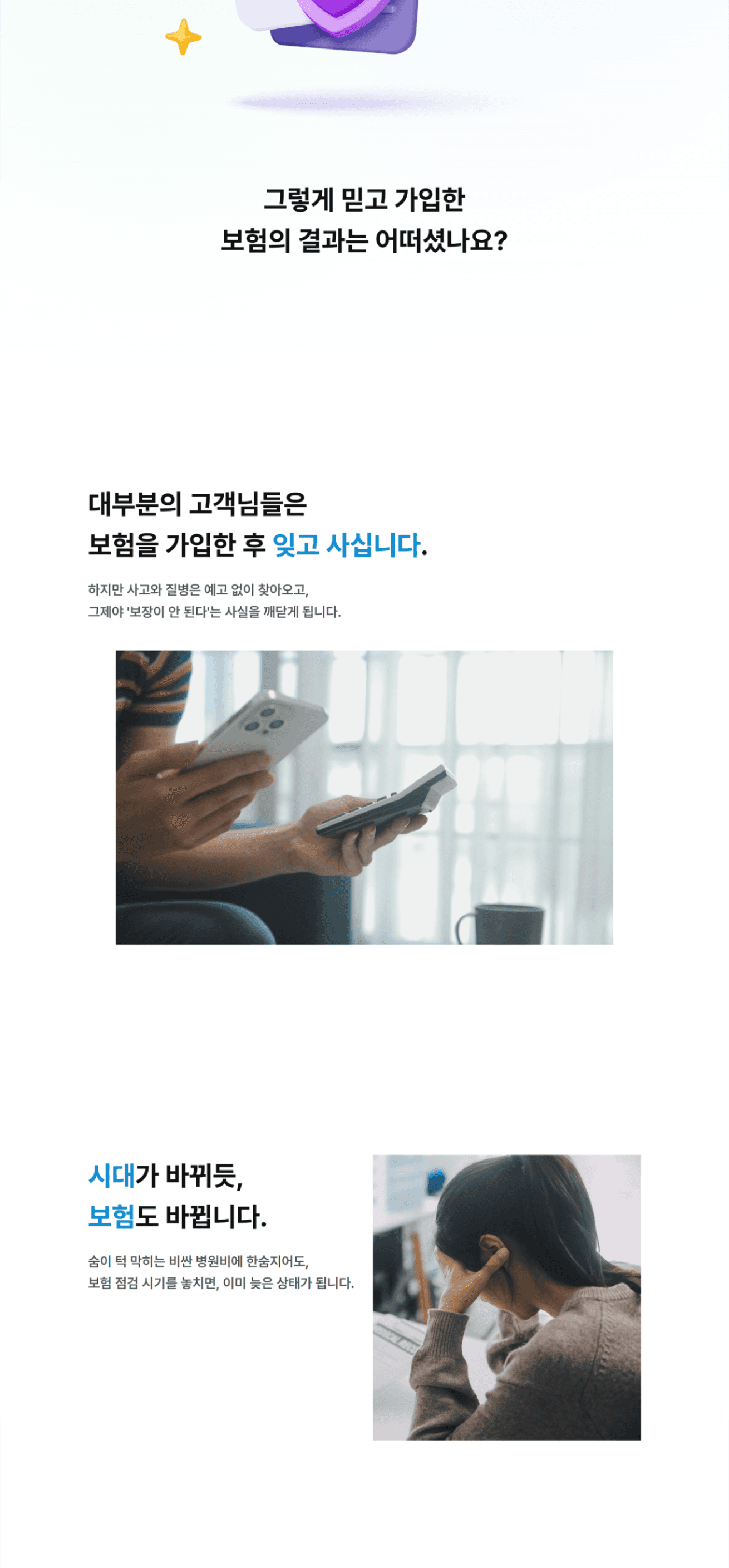 강압적인 영업 느낌을 주던 기존 보험 업계의 이미지를 탈피하고 고객의 심리적 거부감을 낮추고자 하였습니다. 보험 컨설팅으로서의 무게감을 잃지 않도록 전문성이 느껴지는 블루 계열을 메인 컬러로 시각적인 신뢰도를 확보합니다. 동시에 자칫 무겁고 지루해질 수 있는 보험 이야기를 부드럽게 환기하고자 트렌디한 3D 오브젝트를 활용하였습니다. 궁극적으로 텍스트 위주 딱딱한 정보 전달에서 벗어나 고객과 깊은 공감대를 형성하고 정보 습득의 피로도를 낮추는 편안한 사용자 경험을 구현하고자 하였습니다.