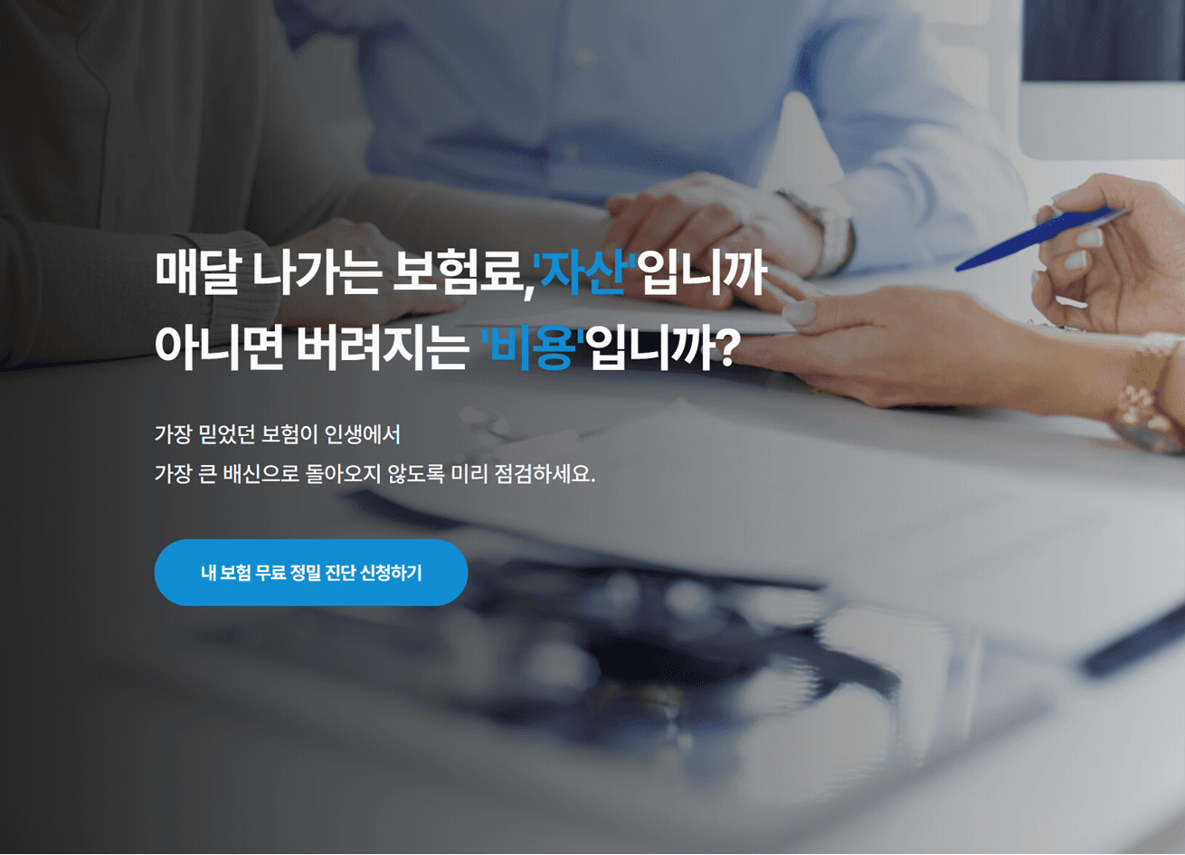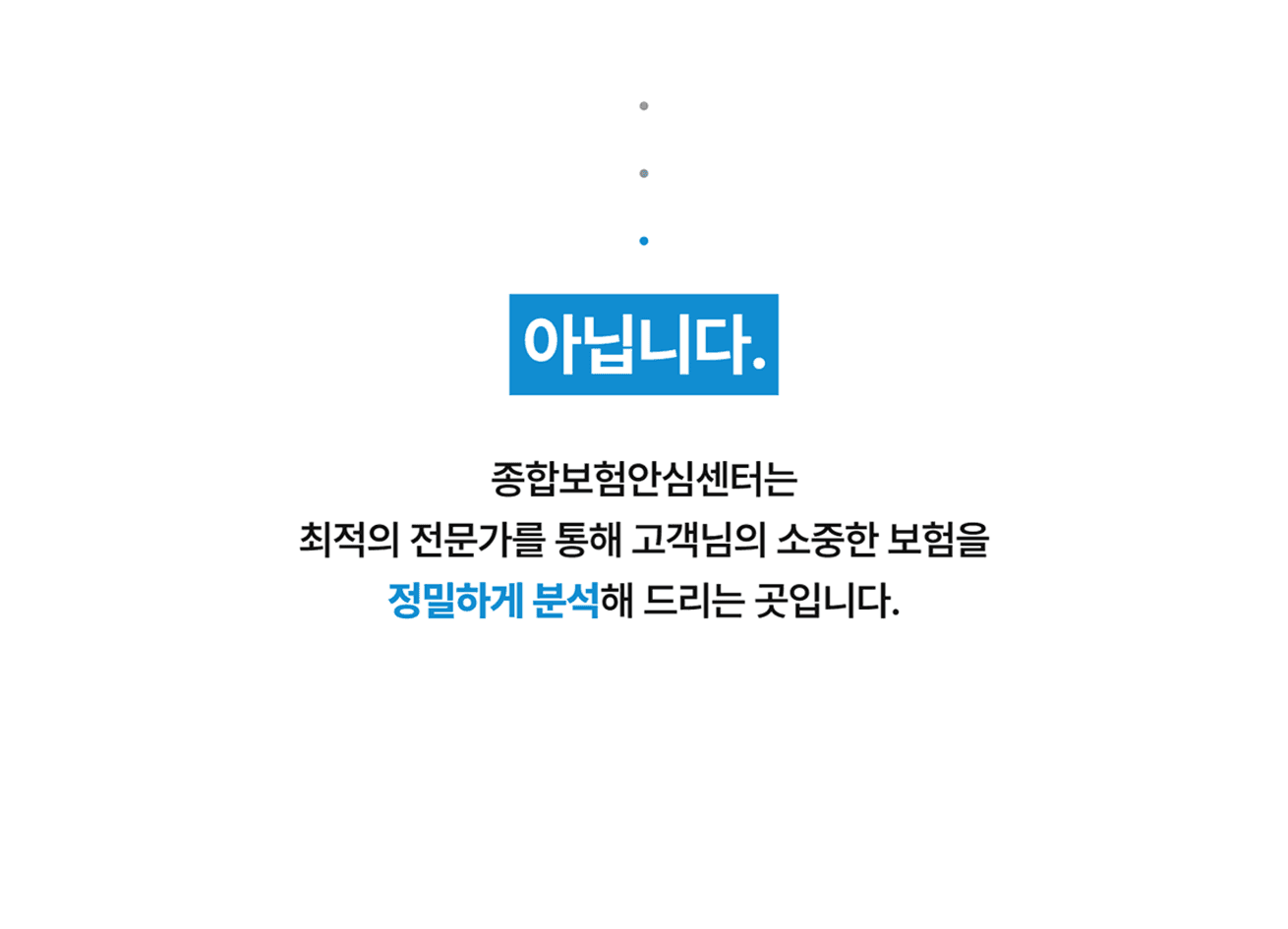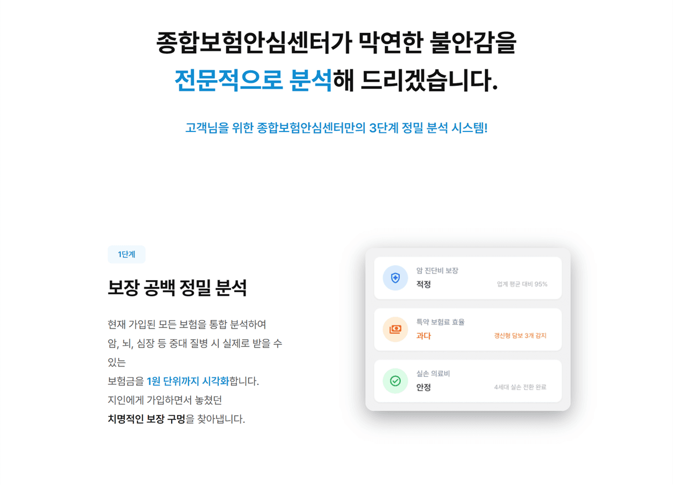 문제에 공감한 고객에게 종합보험안심센터만이 제공할 수 있는 확실한 해결책을 제시합니다. 서비스를 설명할 수 있는 구체적인 이미지와 카피를 사용하여 서비스의 신뢰도를 높이며 고객 스스로 진단의 필요성을 확신하고 정밀 분석 상담을 클릭하도록 유도하였습니다.