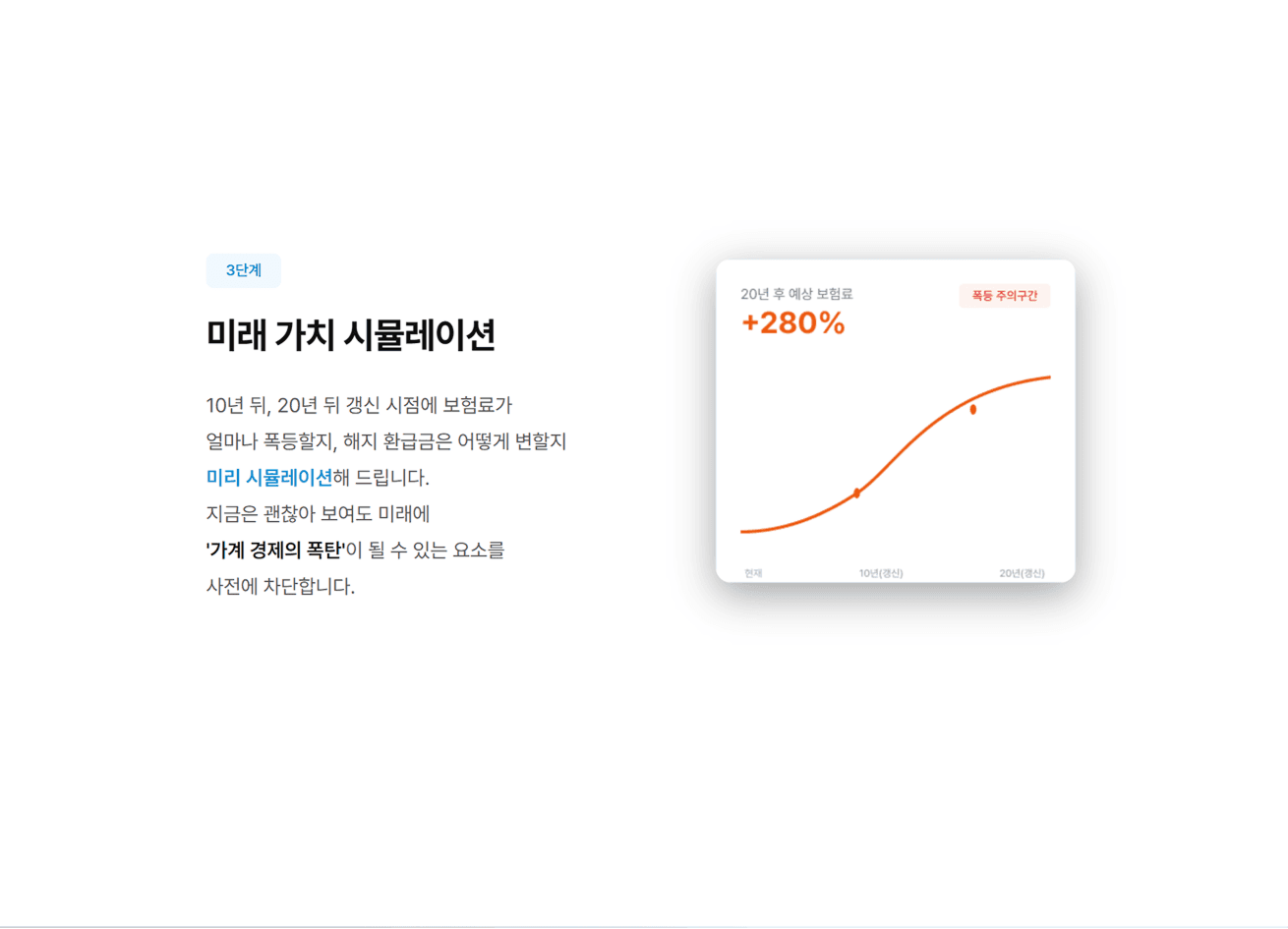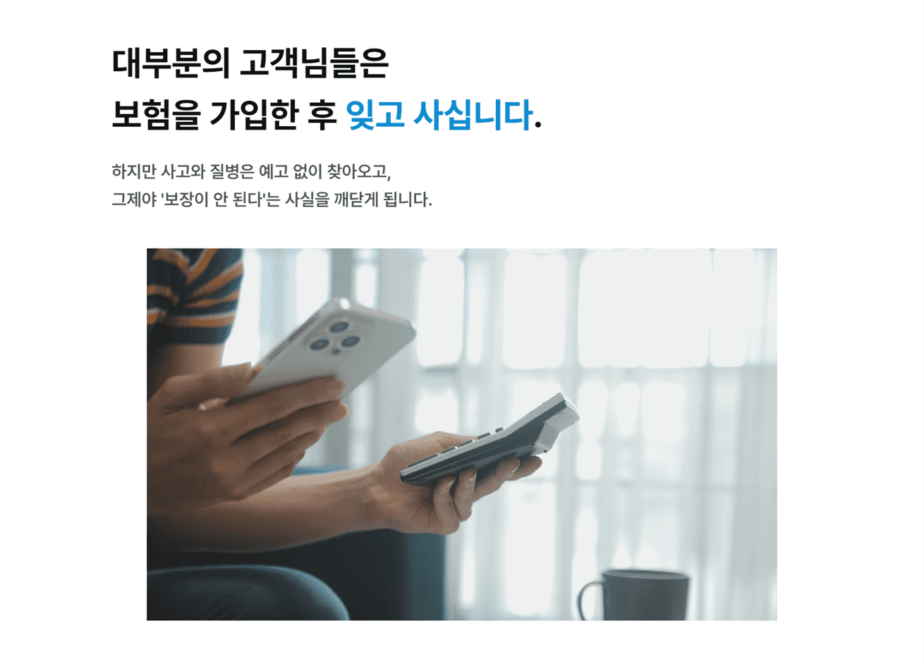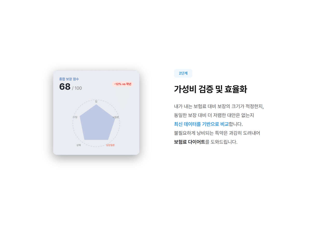 문제에 공감한 고객에게 종합보험안심센터만이 제공할 수 있는 확실한 해결책을 제시합니다. 서비스를 설명할 수 있는 구체적인 이미지와 카피를 사용하여 서비스의 신뢰도를 높이며 고객 스스로 진단의 필요성을 확신하고 정밀 분석 상담을 클릭하도록 유도하였습니다.