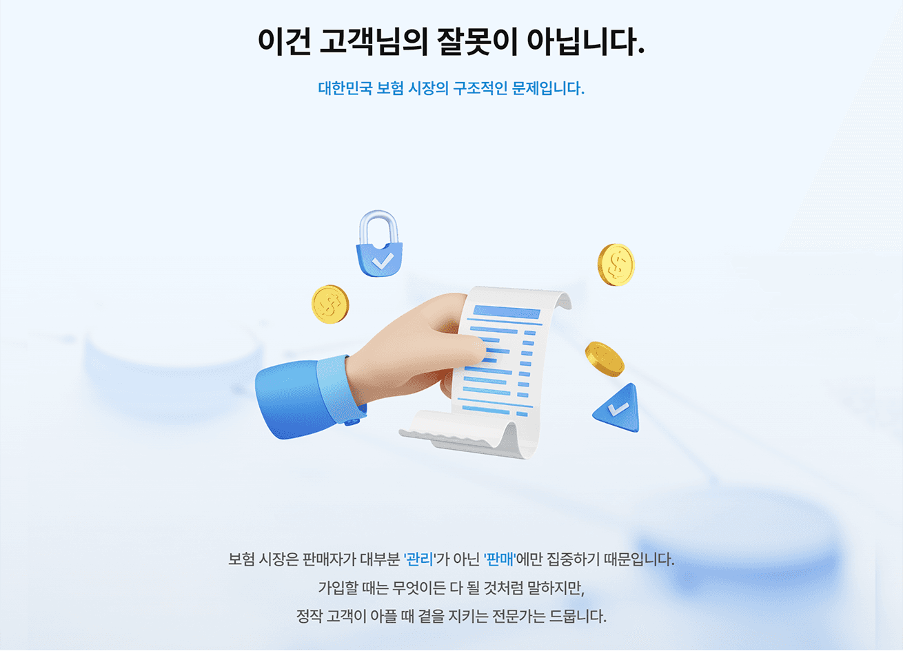 보험 영업에 대한 고객의 근본적인 거부감을 해소하고 과도한 보험료 지출이나 보장 공백과 같은 보험 시장 상 흔하게 겪는 문제를 개인의 무지가 아닌 판매에만 치중된 보험 시장의 구조적인 한계로 인식시켜 허들을 낮추고자 하였습니다. 이를 바탕으로 종합보험안심센터가 제공하는 객관적인 진단 서비스의 필요성을 자연스럽게 인식시키고 이 서비스가 왜 필수적인지 자연스럽게 설득합니다. 궁극적으로 보험에 문제점은 없는지 고객 스스로 의식하고 인지하게 만들어 자사 서비스 이용 유도를 위한 정밀 분석 상담 신청으로 유도합니다.